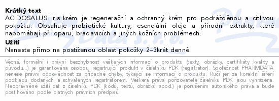 ACIDOSALUS Iris krém je regenerační a ochranný krém pro podrážděnou a citlivou pokožku. Obsahuje probiotické kultury, esenciální oleje a přírodní extrakty, které napomáhají při oparu, bradavicích a jiných kožních problémech.Použití