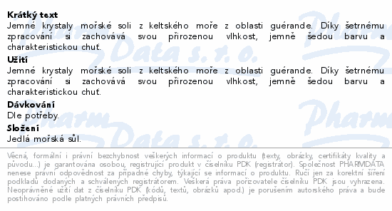 Jemné krystaly mořské soli z keltského moře z oblasti guérande. Díky šetrnému zpracování si zachovává svou přirozenou vlhkost, jemně šedou barvu a charakteristickou chuť.Použití