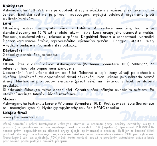 Ashwagandha 10% Withania je doplněk stravy s výtažkem z vitánie, jinak také indický ženšen. Exotická rostlina je přírodní adaptogen, zvyšující odolnost organismu proti civilizačním vlivům.Použití