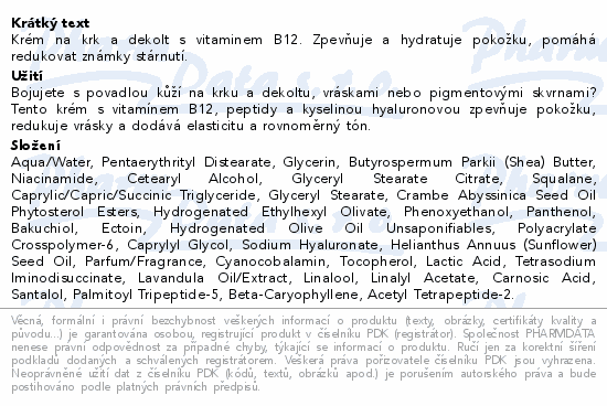 Krém na krk a dekolt s vitaminem B12. Zpevňuje a hydratuje pokožku, pomáhá redukovat známky stárnutí.Použití