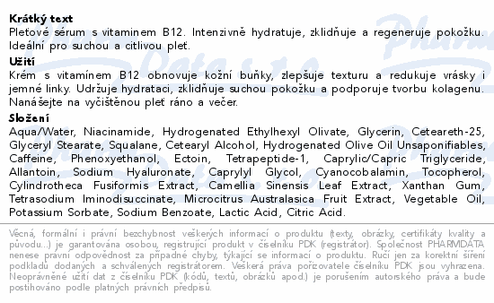 Pleťové sérum s vitaminem B12. Intenzivně hydratuje, zklidňuje a regeneruje pokožku. Ideální pro suchou a citlivou pleť.Použití