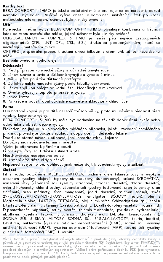 BEBA COMFORT 1 5HMO je tekuté počáteční mléko pro kojence od narození, pokud nemohou být kojeni. Mléčná výživa obsahuje kombinaci unikátních látek po vzoru mateřského mléka, jejichž účinnost byla klinicky ověřená.Použití