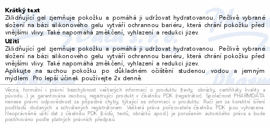 Zklidňující gel zjemňuje pokožku a pomáhá ji udržovat hydratovanou. Pečlivě vybrané složení na bázi silikonového gelu vytváří ochrannou bariéru, která chrání pokožku před vnějšími vlivy. Také napomáhá změkčení, vyhlazení a redukci jizev.Použití