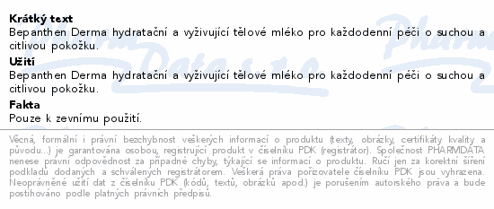 Bepanthen Derma hydratační a vyživující tělové mléko pro každodenní péči o suchou a citlivou pokožku.Použití