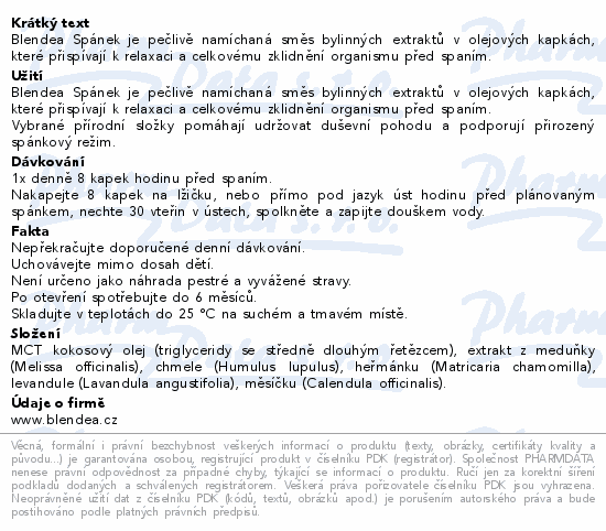 Blendea Spánek je pečlivě namíchaná směs bylinných extraktů v olejových kapkách, které přispívají k relaxaci a celkovému zklidnění organismu před spaním.Použití
