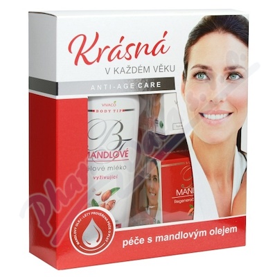 Dárková kosmetická kazeta Krásná v každém věku s mandlovým olejem obsahuje: mandlové tělové mléko 400ml, mandlový pleťový krém denní 50ml, mandlový pleťový krém noční 50ml.Použití