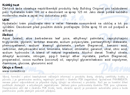 Dárková sada obsahuje nejoblíbenější produkty řady Bulldog Original pro každodenní péči: hydratační krém 100 ml a deodorant ve spreji 125 ml. Jako dárek potěší každého moderního muže a zajistí mu dokonalou péči.Použití