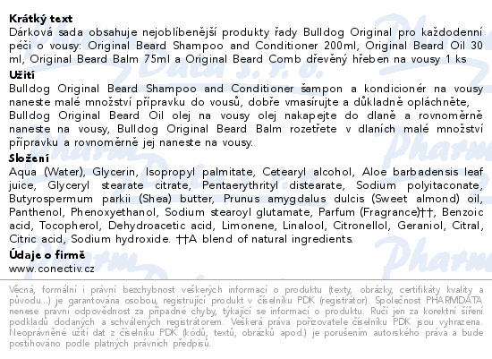 Dárková sada obsahuje nejoblíbenější produkty řady Bulldog Original pro každodenní péči o vousy: Original Beard Shampoo and Conditioner 200ml, Original Beard Oil 30 ml, Original Beard Balm 75ml a Original Beard Comb dřevěný hřeben na vousy 1 ksPoužití