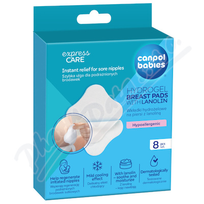 Zklidňující hydrogelové prsní polštářky Canpol babies s lanolinem poskytnou okamžitou úlevu bolavým bradavkám a urychlí hojení. Podporují regeneraci pokožky a zároveň obnovují přirozenou vlhkost tak, abyste mohli pokračovat v kojení. Chladivý účinek.Použití