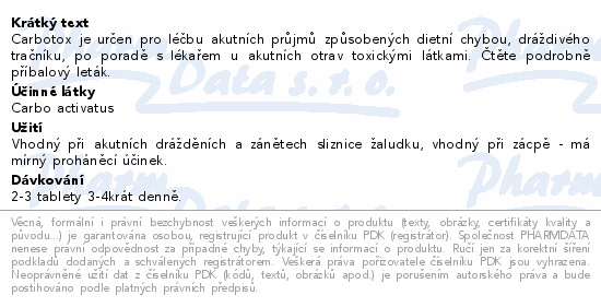 Carbotox je určen pro léčbu akutních průjmů způsobených dietní chybou, dráždivého tračníku, po poradě s lékařem u akutních otrav toxickými látkami. Čtěte pozorně příbalový leták.Použití