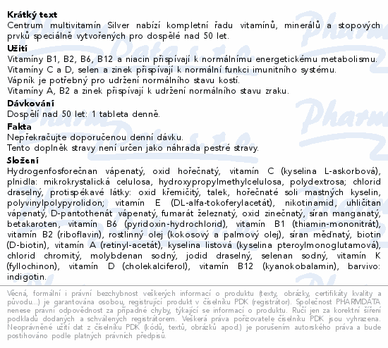 Centrum multivitamín Silver nabízí kompletní řadu vitamínů, minerálů a stopových prvků speciálně vytvořených pro dospělé nad 50 let.Použití