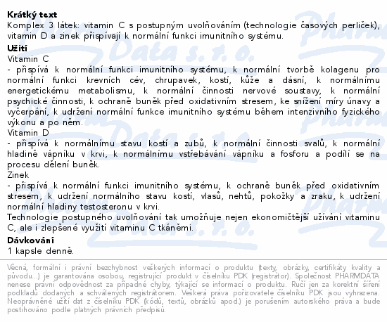 Komplex 3 látek: vitamin C s postupným uvolňováním (technologie časových perliček), vitamin D a zinek přispívají k normální funkci imunitního systému.Použití