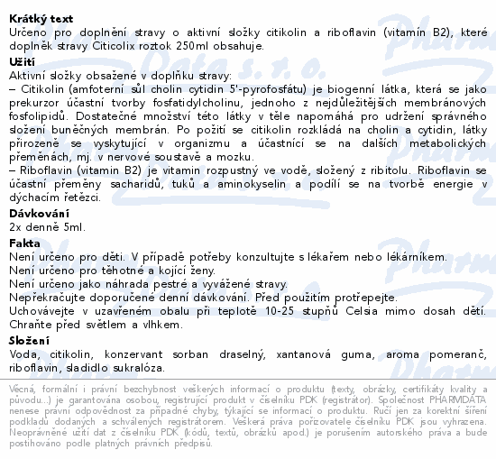 Určeno pro doplnění stravy o aktivní složky citikolin a riboflavin (vitamín B2), které doplněk stravy Citicolix roztok 250ml obsahuje.Použití
