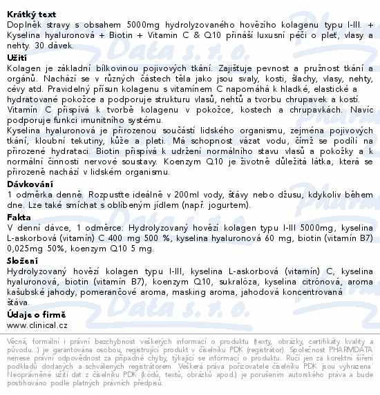 Doplněk stravy s obsahem 5000mg hydrolyzovaného hovězího kolagenu typu I-III. + Kyselina hyaluronová + Biotin + Vitamin C & Q10 přináší luxusní péči o pleť, vlasy a nehty. 30 dávek.Použití
