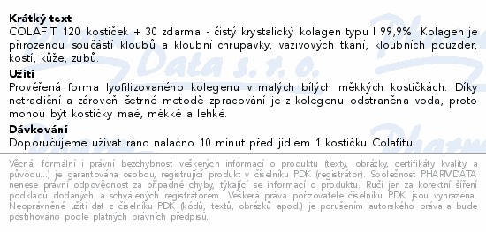 COLAFIT 120 kostiček + 30 zdarma - čistý krystalický kolagen typu I 99, 9%. Kolagen je přirozenou součástí kloubů a kloubní chrupavky, vazivových tkání, kloubních pouzder, kostí, kůže, zubů.Použití