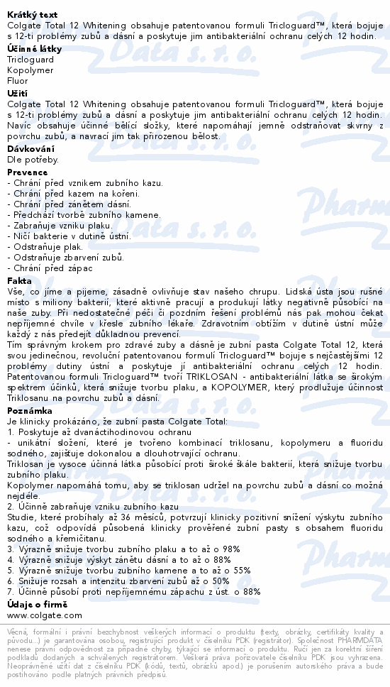 Colgate Total 12 Whitening obsahuje patentovanou formuli Tricloguard™, která bojuje s 12-ti problémy zubů a dásní a poskytuje jim antibakteriální ochranu celých 12 hodin.Použití