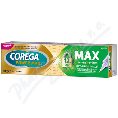 Corega Power Max upevnění a svěžest je fixační krém pro zubní náhrady pro pevnou fixaci po celý den se svěží příchutí máty.Použití
