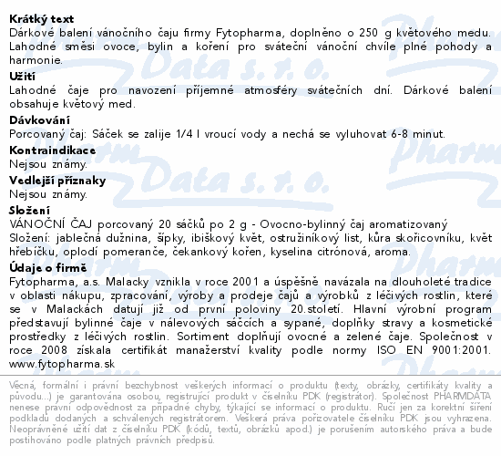 Dárkové balení vánočního čaju firmy Fytopharma, doplněno o 250 g květového medu. Lahodné směsi ovoce, bylin a koření pro sváteční vánoční chvíle plné pohody a harmonie.Použití