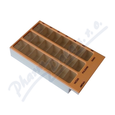 Slouží k přehlednému uspořádání a spolehlivému dávkování léků či potravinových doplňků doma i na cestách. Je označen jednoduchými popisky zobrazujícími denní dobu. Dostupný v několika barevných provedeních. Velikost dávkovače 136 x 81 x 25 mm (d x š x v)Použití