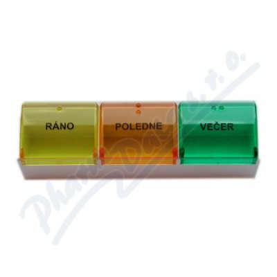 Slouží k přehlednému uspořádání a spolehlivému dávkování léků či potravinových doplňků doma i na cestách. Je označen jednoduchými popisky zobrazujícími denní dobu. Velikost dávkovače 95 x 24 x 25 mm (d x š x v).Použití