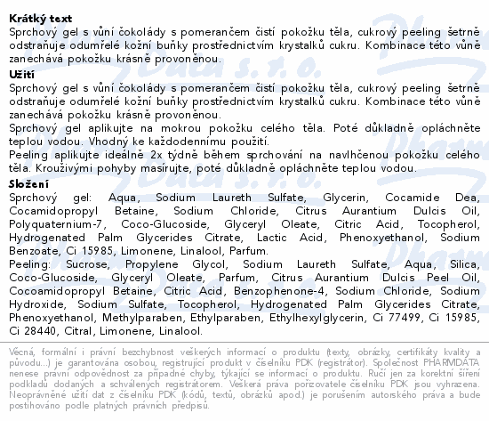 Sprchový gel s vůní čokolády s pomerančem čistí pokožku těla, cukrový peeling šetrně odstraňuje odumřelé kožní buňky prostřednictvím krystalků cukru. Kombinace této vůně zanechává pokožku krásně provoněnou.Použití