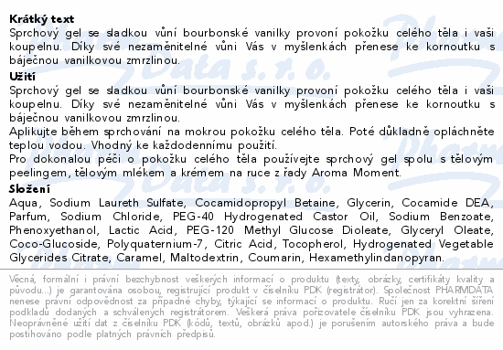 Sprchový gel se sladkou vůní bourbonské vanilky provoní pokožku celého těla i vaši koupelnu. Díky své nezaměnitelné vůni Vás v myšlenkách přenese ke kornoutku s báječnou vanilkovou zmrzlinou.Použití