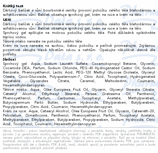 Dárkový balíček s vůní bourbonské vanilky provoní pokožku celého těla blahodárnou a sofistikovanou vůní. Balíček obsahuje sprchový gel, krém na ruce a krém na tělo.Použití