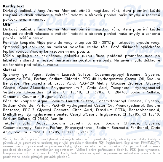 Dárkový balíček z řady Aroma Moment přináší magickou vůni, která promění každé koupání ve chvíli relaxace a sváteční radosti a zároveň pohladí vaše smysly a zanechá pokožku svěží a hebkou.Použití