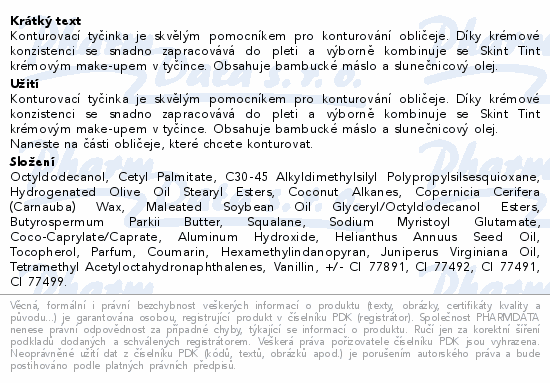 Konturovací tyčinka je skvělým pomocníkem pro konturování obličeje. Díky krémové konzistenci se snadno zapracovává do pleti a výborně kombinuje se Skint Tint krémovým make-upem v tyčince. Obsahuje bambucké máslo a slunečnicový olej.Použití
