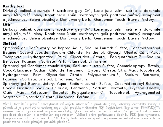 Dárkový balíček obsahuje 3 sprchové gely 3v1, které jsou velmi šetrné a dokonale umyjí tělo, tvář i vlasy. Kombinace 3 vůní sprchových gelů podtrhne mužský sexappeal a jedinečnost. Balení obsahuje: Don´t worry be h., Gentleman Touch, Eternal Victory.Použití