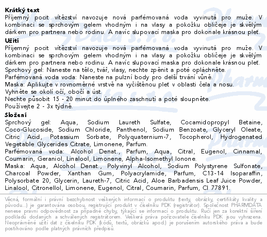Příjemný pocit vítězství navozuje nová parfémovaná voda vyvinutá pro muže. V kombinaci se sprchovým gelem vhodným i na vlasy a pokožku obličeje je skvělým dárkem pro partnera nebo rodinu. A navíc slupovací maska pro dokonale krásnou pleť.Použití