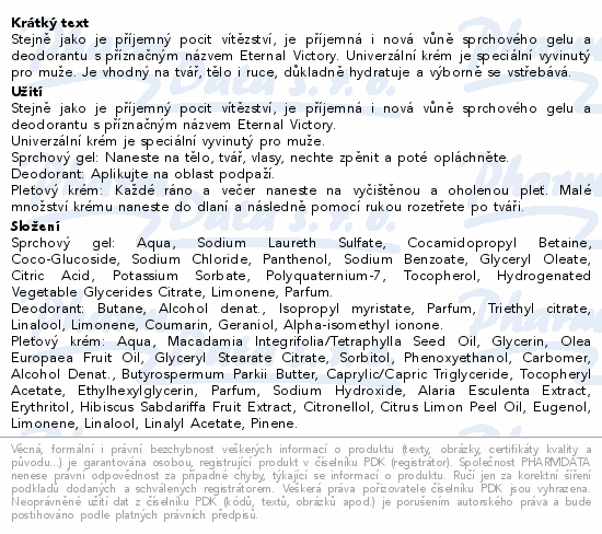 Stejně jako je příjemný pocit vítězství, je příjemná i nová vůně sprchového gelu a deodorantu s příznačným názvem Eternal Victory. Univerzální krém je speciální vyvinutý pro muže. Je vhodný na tvář, tělo i ruce, důkladně hydratuje a výborně se vstřebává.Použití