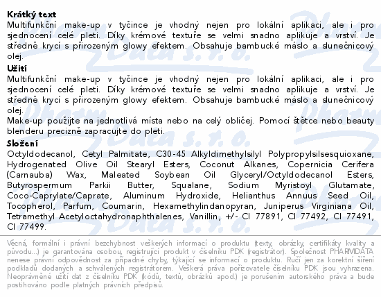 Multifunkční make-up v tyčince je vhodný nejen pro lokální aplikaci, ale i pro sjednocení celé pleti. Díky krémové textuře se velmi snadno aplikuje a vrství. Je středně krycí s přirozeným glowy efektem. Obsahuje bambucké máslo a slunečnicový olej.Použití