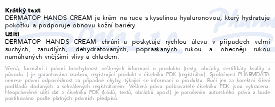DERMATOP HANDS CREAM je krém na ruce s kyselinou hyaluronovou, který hydratuje pokožku a podporuje obnovu kožní bariéry.Použití