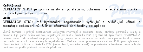 DERMATOP STICK je tyčinka na rty s hydratačním, ochranným a reparačním účinkem na bázi kyseliny hyaluronové.Použití