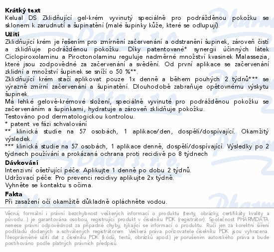 Kelual DS Zklidňující gel-krém vyvinutý speciálně pro podrážděnou pokožku se sklonem k zarudnutí a šupinatění (malé šupinky kůže, které se odlupují).Použití
