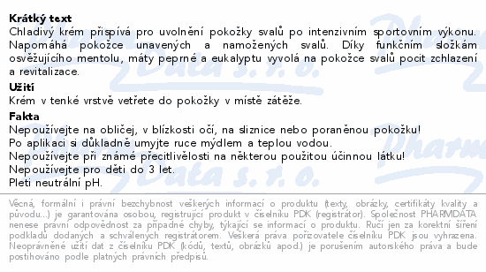 Chladivý krém přispívá pro uvolnění pokožky svalů po intenzivním sportovním výkonu. Napomáhá pokožce unavených a namožených svalů. Díky funkčním složkám osvěžujícího mentolu, máty peprné a eukalyptu vyvolá na pokožce svalů pocit zchlazení a revitalizace.Použití