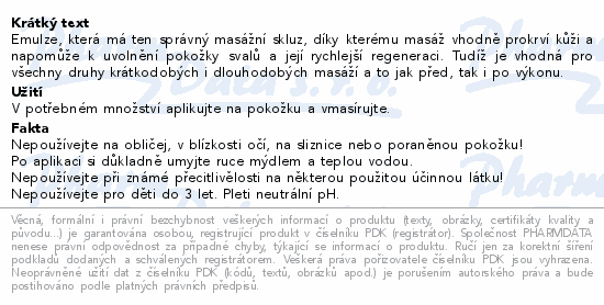 Emulze, která má ten správný masážní skluz, díky kterému masáž vhodně prokrví kůži a napomůže k uvolnění pokožky svalů a její rychlejší regeneraci. Tudíž je vhodná pro všechny druhy krátkodobých i dlouhodobých masáží a to jak před, tak i po výkonu.Použití