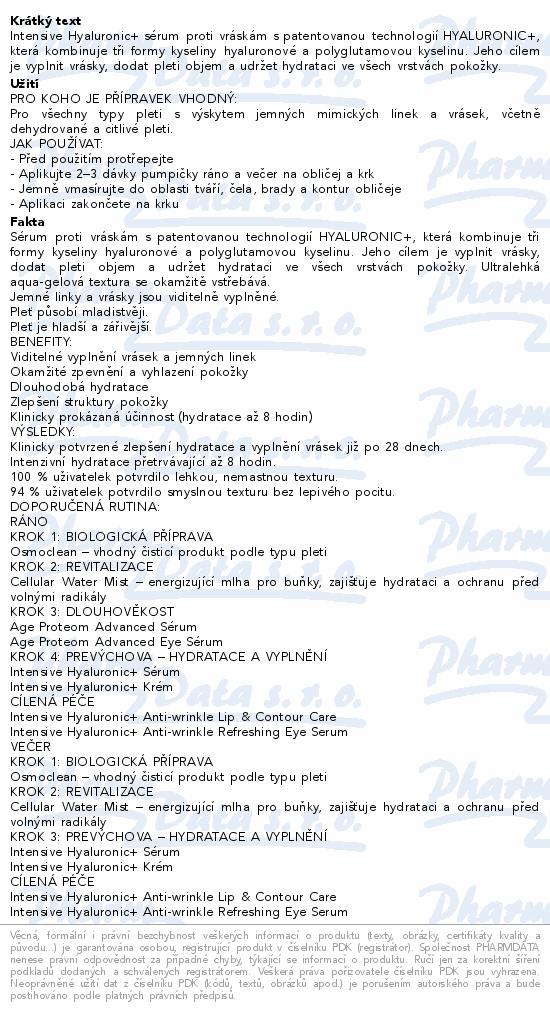 Intensive Hyaluronic+ sérum proti vráskám s patentovanou technologií HYALURONIC+, která kombinuje tři formy kyseliny hyaluronové a polyglutamovou kyselinu. Jeho cílem je vyplnit vrásky, dodat pleti objem a udržet hydrataci ve všech vrstvách pokožky.Použití