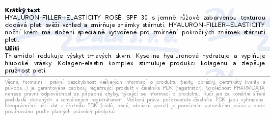 HYALURON-FILLER+ELASTICITY ROSÉ SPF 30 s jemně růžově zabarvenou texturou dodává pleti svěží vzhled a zmírňuje známky stárnutí. HYALURON-FILLER+ELASTICITY noční krém má složení speciálně vytvořené pro zmírnění pokročilých známek stárnutí pleti.Použití