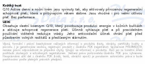 Q10 Active denní a noční krém jsou vyvinuty tak, aby aktivovaly přirozenou regenerační schopnost pleti, která s přibývajícím věkem slábne. Jsou vhodné i pro velmi citlivou pleť. Bez parfemace.Použití