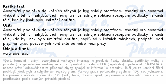 Absorpční podložka do kožních záhybů je hygienický prostředek vhodný pro absorpci vlhkosti z tělních záhybů. Jedinečný tvar usnadňuje aplikaci absorpční podložky na části těla, kde by jinak bylo umístění obtížné.Použití