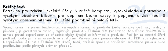 Potravina pro zvláštní lékařské účely. Nutričně kompletní, vysokokalorická potravina s vysokým obsahem bílkovin pro doplnění běžné stravy k popíjení, s vlákninou. S vysokým obsahem vitaminu D. Čtěte pozorně příbalový leták.Použití