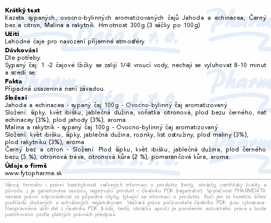 Kazeta sypaných, ovocno-bylinných aromatizovaných čajů Jahoda a echinacea, Černý bez a citron, Malina a rakytník. Hmotnost 300g (3 sáčky po 100g)Použití