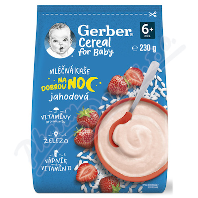 GERBER Cereal mléčná kaše jahodová Dobrou noc je kombinací vysoce kvalitní rýžové mouky, jemné chuti jahod a vitamínů, která uspokojí potřeby děťátka i jeho mlsný jazýček. Kaše je vhodná pro kojence od ukončeného 6. měsíce.Použití