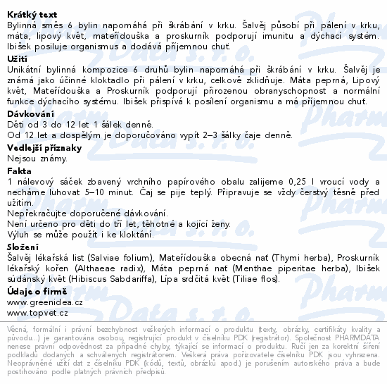 Bylinná směs 6 bylin napomáhá při škrábání v krku. Šalvěj působí při pálení v krku, máta, lipový květ, mateřídouška a proskurník podporují imunitu a dýchací systém. Ibišek posiluje organismus a dodává příjemnou chuť.Použití