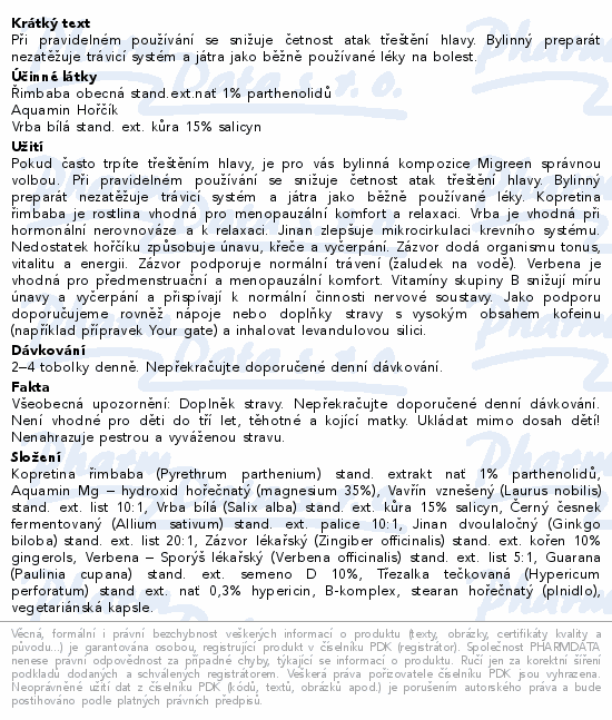 Při pravidelném používání se snižuje četnost atak třeštění hlavy. Bylinný preparát nezatěžuje trávicí systém a játra jako běžně používané léky na bolest.Použití