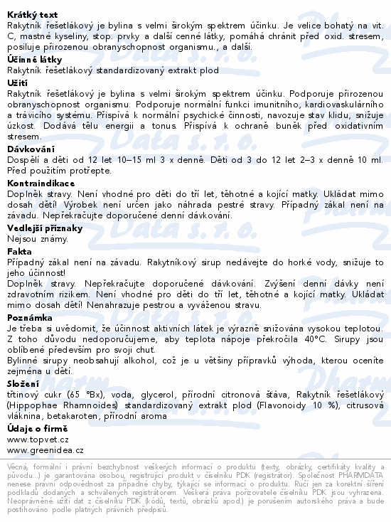 Rakytník řešetlákový je bylina s velmi širokým spektrem účinku. Je velice bohatý na vit. C, mastné kyseliny, stop. prvky a další cenné látky, pomáhá chránit před oxid. stresem, posiluje přirozenou obranyschopnost organismu., a další.Použití