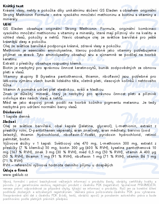 Krásné vlasy, nehty a pokožka díky unikátnímu složení GS Eladen s obsahem originální Strong Methionin Formule - extra vysokého množství methioninu a biotinu s vitaminy a minerály.Použití