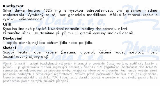 Silná dávka lecitinu 1325 mg s vysokou vstřebatelností, pro správnou hladinu cholesterolu. Vyrobený ze sóji bez genetické modifikace. Měkké želatinové kapsle s vysokou vstřebatelností.Použití